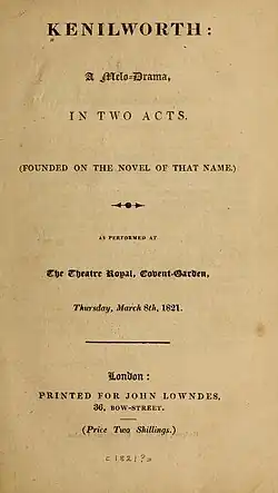 Kenilworth is an 1821 historical play by the British writer Alfred Bunn.[1] A melodrama, based on the novel of the same title by Walter Scott, it premiered at the Theatre Royal, Covent Garden in London on 8 March 1821.[2] A separate adaptation of the novel by Thomas Dibdin appeared at the Surrey Theatre the same year.[3] The original Covent Garden cast included John Vandenhoff as the Earl of Leicester, William Abbot as Varney, Henry Erskine Johnston as Sir Walter Raleigh, Charles Connor as Tresilian, Thomas Comer as Michael Lambourne, Charles Farley as Antony Foster, Harriet Faucit as Queen Elizabeth and Mary Vining as Countess of Leicester.
