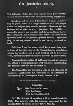 The society, formed in March 1865, met at the Kensington home of its president, Charlotte Manning, and enjoyed a close relationship with English institutions of higher education amenable to women.[1] Most members were young, unmarried, educated, middle class women. Nine of the original 11 members were not married, suggesting a broader commitment to female empowerment.[2] The society included: Barbara Bodichon, Emily Davies, Frances Buss, Dorothea Beale, Jessie Boucherett, Elizabeth Garrett Anderson, Helen Taylor, Charlotte Manning, Anna Swanwick, Anne Clough, and Rosamond Davenport Hill.[3] Another early member, Emilia Russell Gurney, was the wife of Russell Gurney who introduced legislation in parliament on women's rights to property and to practise medicine.[4] Membership expanded to 33 members by the official founding, a total of 58 members in the following year and 67 by its end in 1868.[5]