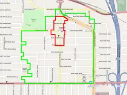 Kenton's principal commercial district is located on North Denver Avenue, extending roughly four blocks south from North Interstate Avenue, where the Paul Bunyan statue stands. The district was developed mainly between 1910 and 1949, and contains an unusually high concentration of buildings constructed using ornamental concrete blocks. The area developed directly as an outgrowth of Swift & Company's decision to run a streetcar line along the street from its stockyards to the rest of the Portland streetcar network. The district was listed on the National Register of Historic Places in 2001 for its role in the development of the neighborhood and the city.[2]