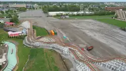 In November 2018, Kentucky Flyer's plane-themed lead car was put on display at the IAAPA 2018 Expo in Orlando, Florida.[8] Foundations would continue to be poured during that time, and the coaster structure would go vertical on November 30, 2018.[9] Work would continue throughout the winter and be completed in late March to early April 2019. On April 12, 2019, Kentucky Flyer reportedly began testing trains on the layout,[10] and the coaster opened to the public later that month, on April 28.[11]