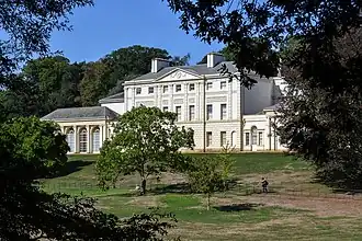There are two drives leading to the house from Hampstead Lane. Each has a gated white-brick lodge. The north, or main entrance front of the house was designed by Robert Adam and is set in Stucco with a central portico. The south front is constructed out of a single Stucco block. It was restored to its original design in 1975. To the east of the house is the service wing, constructed from London stock brick. Opposite this is the brick house, designed as a cold-plunge bath.[1]