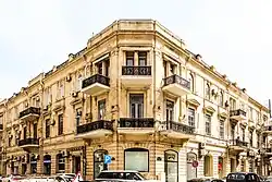 5 House of Musa Nagiyev Khagani alley, 14 The building was built in 1910 by the order of Musa Nagiyev. Ploshko used the classical style and order system style direction of the style. Large pilasters of ionic columns connected the risalites in the corner and the central part in the form of a portico for two floors. The rhythm of the window openings with alternating curved and rectangular sanders, expensive frames determines the volume plasticity of the facade, which is distinguished by a proportional distribution of traction between the floors and a successfully increased cornice. Renaissance balcony railings on the facade attract special attention and actively participate in the formation of the artistic image of the house.[7]