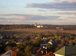 Khotiv from the south. The Khotiv hillfort is in the background, and St. Panteleimon's Cathedral is seen near the horizon in the right.
