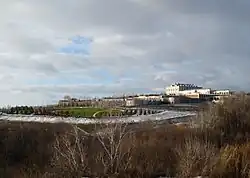 The building on the hillfort began in 2009. Initially its customer was unknown, and an information board on the building site announced construction of a new entrance to Feofaniya Park.[28] Gradually, a luxurious palace surrounded by terraces appeared there.[4][29] As of 2016, the northern part of the hillfort (one of the richest in remains of ancient buildings and enclosed with the highest rampart),[1] including its fortification, and the landscape of adjacent areas was demolished.[5] According to Yuri Kosiuk, "the building which is built is built in a chasm, and it has nothing to do with the hillfort".[4]