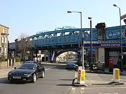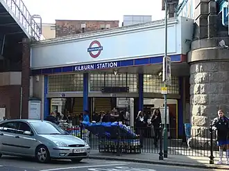 Kilburn serves the area of the name itself, which is a moderate commercial district and dense residential suburb. The place was said to be named after Cylla, then a Saxon, or from the 1121 Saxon term "Cuneburna" for "the cattle stream".[8] The earliest settlements near the station date back to 1847.[9] The station is on the A5 Kilburn High Road or Shoot-up Hill. The road connects several stations including Brondesbury and Kilburn High Road. Nearby landmarks include the Red Lion, Kiln Theatre, Kilburn Grange Park, ICMP London and Kingsgate Primary School.[10]