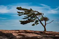 Killbear Provincial Park features a "picture-perfect" windswept isolated white pine growing on a rock outcrop.[2][6] In 2019, after a major limb died over two years, the tree began showing signs of damage.[2] Following a major ice storm, the tree had two support rods installed in 2022.[7]
