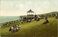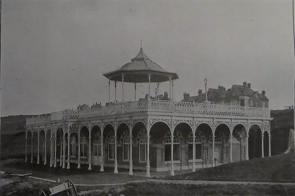 The original building was a bandstand funded in 1903–1904 by Thomas Dence (1840–1918), a local developer who had been involved in the Frome Park Estate in Stroud Green and roads in the parish of St Mary, Islington, and owned property in Herne Bay.[6][8][9][10][11] Dence had moved to Herne Bay for his health, bought the Downs, laid out roads at the top and built himself a house on Beacon Hill close by.[12] He conveyed the remaining sloping land back to the council, and in 1901 and 1903 suggested plans for a bandstand.[3][4][12] He had in mind: