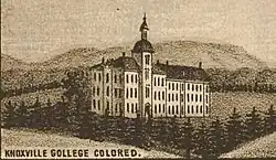 Knoxville College is rooted in a mission school established in Knoxville in 1864 by R. J. Creswell of the United Presbyterian Church to educate the city's free Black and formerly enslaved people.[4] This school initially met in the First Baptist Church building (which at the time was located on Gay Street) before moving to a permanent facility in East Knoxville in 1866.[4] In spite of general apathy from the city's leaders and threats from poor whites, the school's enrollment gradually grew to over 100.[4] In addition to black students, the school also had many white students until 1901, when Tennessee passed a law forcibly segregating all schools.[5]