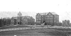 In the 1870s, the church's Freedmen's Mission, which had established mission schools for freed slaves across the South, decided to refocus its efforts on building a larger, better-equipped school in Knoxville, in part due to stiff competition from other denominations in Nashville.[4] In 1875, the church sold its East Knoxville property and purchased its current property, which at the time consisted of a hill that had been occupied by a Confederate battery during the Civil War.[6] The school's first building, McKee Hall, named for O.S. McKee, was completed in 1876, and the school opened in December of that year.[4] Former governor William G. Brownlow and gubernatorial candidate William F. Yardley spoke at the opening ceremonies.[7]