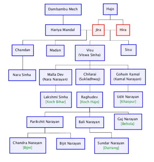 14. ^ "[Hajo] had two daughters, Hira and Jira of whom Hira was married to Hariya, a member of the "impure tribe" called Mech."(Nath 1989:17)