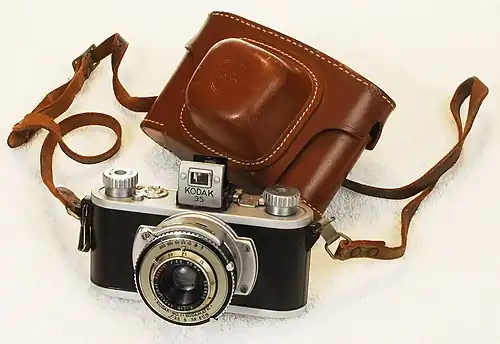 The first Kodak 35 had no rangefinder.[3] It slightly resembles cameras like the German Wirgin Edinex and Adox Adrette.[4] It takes thirty-six 24×36 mm frames on 135 film. The precision molded black Bakelite body has satin-chromed top and base plates, and a collapsible finder is mounted on top center. The removable Bakelite back with the attached base plate slides easily off for film handling. It is secured by a centrally located wing key in the base plate. Turning the key also slackens the spring tension of the chromed steel film pressure plate, a very unusual feature presumably incorporated to facilitate reassembling the camera rather than preventing scratching the film during rewind, which would have been a novel feature.
