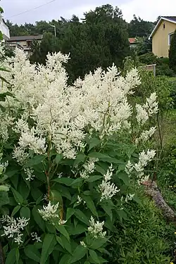 This plant is grown as an ornamental perennial. It grows to a height of 150–200 cm (4 ft 11 in – 6 ft 7 in). Flowering in June,[12][13] or July to August in far northern latitudes,[23] it has creamy white flowers which turn pink as they age. Although shrub-like in appearance, it is herbaceous, dying back to the ground over winter.[12][17] It has been described as "very good value for almost instant impact"[12] and an "eye-catcher",[9] although some people find the flower scent to be unpleasant.[9][12][23]