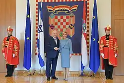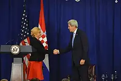 On 11 April 2016, after meeting with Nicolas Dean, the special envoy for Holocaust of the United States Department of State, Grabar-Kitarović stated that the "Independent State of Croatia (NDH) was least independent and was least protecting the interests of the Croatian people". Adding that the "Ustaše regime was criminal regime", that "anti-fascism is in the foundation of the Croatian Constitution" and that the "modern Croatian state has grown on the foundations of the Croatian War of Independence."[59] In May 2016, Grabar-Kitarović visited Tehran on the invitation of Iranian President Hassan Rouhani. Rouhani called on Croatia to be the gateway to Iran's ties with Europe.[60][61] The two presidents reaffirmed the traditionally good relations between their countries and signed an agreement on economic cooperation.[62]