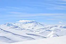 The Korab-Koritnik Nature Park starts on the frontier with Kosovo in the north along the border with North Macedonia to the Desha Mountains in the south. The nature park is named after the Korab Mountains and Koritnik Mountain. Korab is the highest summit of both Albania and North Macedonia, standing at an elevation of 2,764 metres (9,068 ft). It is also one of only two summits in Europe, which is the highest point for more than one country and as well the 18th-most prominent mountain peak in Europe.[6][7] The summit is a very rugged mountain massif and consists mainly of shale and limestone of the Paleozoic period with block structures and also severely damaged gypsum rocks of permo Triassic. On the west side, the mountain falls steeply over rock walls, while the north side consists of craggy rocks.[8]