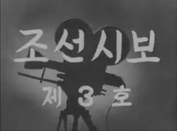 Korean Newsreel (Korean조선시보; Hanja朝鮮時報) is a North Korean newsreel series that first premiered in March 1948.[1][2][3] It was produced by the National Film Studio of North Korea (국립영화촬영소) until 1957, when the National Film Studio became the Korean Art Film Studio (조선예술영화촬영소) and a separate studio for producing documentaries and newsreels, the Korean Documentary Film Studio (조선기록영화촬영소), was established.[4] Production of the series continued even during the 1950–1953 Korean War, with film reporters moving alongside North Korean troops during the fighting. Another newsreel was produced between 1950 and 1953 titled For The Reunification of the Fatherland (조국통일을 위하여). It is not known with certainty how many episodes of the series were created, with different sources citing 40, 70, and 80 episodes.[5]