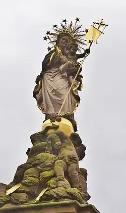 This iconography is based on the motif of "Our Lady of Victory," which became popular in the 17th century in the course of the Counterreformation. In the Heidelberg context, the slaying of the monstrous snake was intended as an allegory for the battle against the Protestant "erroneous belief."[5] Other attributes of the sculpture point to various aspects of the Mary cult: the crown of rays with twelve stars and the lilies recall the Immaculate Conception. Crown and sceptre symbolise Mary's role as queen of heaven. The trampling of the snake and the crescent moon at her feet are symbols of her role as the Woman of the Apocalypse. The putti in the clouds stand for the Assumption of Mary and the rays of light in the clouds are the rays of mercy, which Mary sends to the world.[5]
