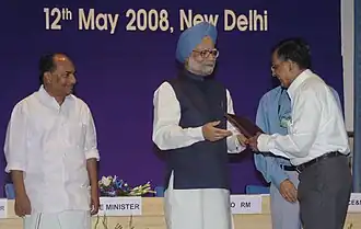 The prime minister, Dr. Manmohan Singh, presenting the Life Time Achievement Award-2007 to Dr. Kota Harinarayana at the DRDO award presentation ceremony, in New Delhi on 12 May 2008