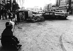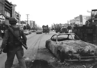 The Koza riot (Japanese: コザ暴動, Hepburn: Koza bōdō) was a violent and spontaneous protest against the US military presence in Okinawa, which occurred on the night of December 20, 1970, into the morning of the following day. Roughly 5,000 Okinawans clashed with roughly 700 American MPs in an event which has been regarded as symbolic of Okinawan anger against 25 years of US military administration.[1][2] In the riot, approximately 60 Americans and 27 Okinawans were injured, 80 cars were burned, and several buildings on Kadena Air Base were destroyed or heavily damaged.[3][4]