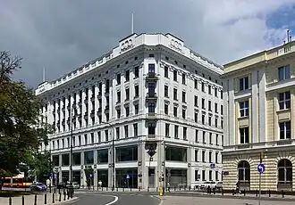 The Krasiński Tenement (Polish: Kamienica Krasińskich), also known as the Heurich Tenement (Polish: Kamienica Heurichowska), and the Raczyński Tenement (Polish: Kamienica Raczyńskiego), is a historic seven-storey tenement house in Warsaw, Poland, located at 2 Małachowski Square, in the neighbourhood of North Downtown. It was designed by Jan Fryderyk Heurich and Artur Goebel, in neoclassical style, and constructed between 1907 and 1910, originally being used as a tenement house. It was destroyed during the Second World War, and rebuilt in 1950, serving as a headquarters of the Ministry of Post and Telegraphs, and Ministry of Communication. In 2014, it was renovated and turned into an office building. This includes construction of a new modernist wing.