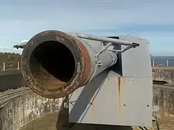 The fort was constructed between 1941 and 1944 by the German navy. Together with four other coastal batteries, it formed a part of the Kristiansand Artillery Group. Together with its sister battery at Hanstholm in Denmark, Møvik Fort was built to obstruct Allied naval forces by blocking the Skagerrak strait and the seaways to Eastern Norway, the Kattegatt Bay, the Baltic Sea and the Baltic region for the allied naval forces.[1] Only a field, ten nautical miles wide, in the Skagerrak could not be covered by the guns of these facilities. This field was therefore mined.[2]