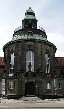 The main entrance is on the southern side of the central domed building facing the Festplatz (formerly Hindenburg-Platz, today Platz der Völkerfreundschaft). From the domed building, which is closed off by a viewing platform, there are three wings at right angles to each other, of which the eastern wing houses the Ratsschulbibliothek Zwickau and the city archive including reading room. The west wing houses the mineralogical-geological collections in the basement, the sculpture collection on the ground floor and the painting collection on the upper floor. The single-storey north wing houses special exhibitions and storage rooms. The eclectic representative building with its neo-baroque façade decoration is a listed building.[9]