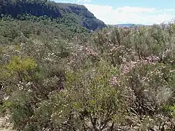This kunzea grows in woodland, forest or exposed cliffs north of the Mount Kaputar National Park in New South Wales and in south-east Queensland.[2][3]