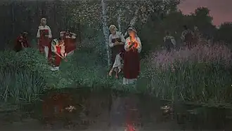 The obligatory custom on this day was mass bathing. It was believed that on this day all evil spirits would leave the rivers, so it was safe to swim until Elijah's day.[54] In addition, the water of Kupala Night was endowed with revitalizing and magical properties.[55]