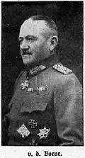 On 20 December 1918, he was appointed Commander of the VI Corps.[13] Simultaneously, Borne was assigned to the Greater Polish Uprising, becoming Commander of Armeeoberkommando Süd on 10 January 1919.[14] He commanded about 106 thousand soldiers in this role, and he was supported by Fritz von Lossberg.[15] In March 1919 he received orders from the Armeeoberkommando to undertake an operation called Stellungskrieg, where he was assigned to attack Poland through the south, advancing from Lower Silesia towards Kalisz.[16] However, this plan was abandoned after the social "unrest" in Germany made the plan impossible.[16]