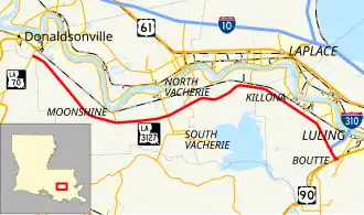 Louisiana Highway 3127 (LA 3127) is a state highway in Louisiana that serves Ascension, St. James, St. John the Baptist, and St. Charles Parishes. It spans 42.1 miles (67.8 km) in a northwest to southeast direction.[1] It parallels LA 18 along the west bank of the Mississippi River, providing a much shorter inland bypass of the River Road. It is bannered in all four cardinal directions depending upon the part of the route.