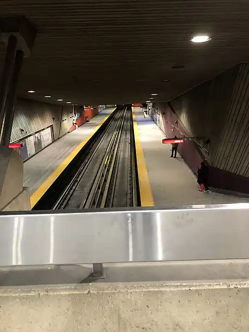 Designed by Didier, Gillon et Larouche, it is a normal side platform station with one ticket hall and access. The platform and mezzanine walls are enlivened by large, irregular concrete planes painted in bright colours, designed by Michèle Tremblay-Gillon, while a stainless-steel mural by Peter Gnass above the ticket hall reflects sunlight and passengers' movements.