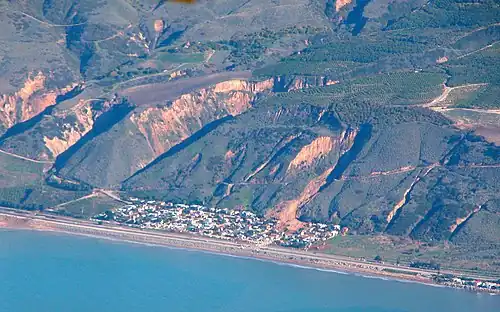 La Conchita is a small community located on the southern California coastline between Ventura and Santa Barbara.[2] It lies on a narrow strip of land about 250 meters (820 feet) wide between the shoreline and abutting a 180-meter (590 ft) high bluff.[2] The top of the bluff was covered by avocado and citrus orchards. The bluff above La Conchita has a slope of approximately 35 degrees and consists of poorly cemented marine sediments.[2]