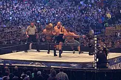 At WrestleMania XXIV on March 30, both Edge and Chavo lost their championships to The Undertaker and Kane respectively, with Edge tapping out to Undertaker's new gogoplata submission move (which would eventually be called Hell's Gate) and Chavo making a WrestleMania record by losing in nine seconds.[20] While signing a contract for his rematch, Chavo introduced Bam Neely, given a history as a border guard turned body guard, as his new enforcer and member of La Familia.[21][22] Despite this help and Vickie's power, both Edge and Chavo failed to win back their titles at Backlash on April 27, with Edge being stretchered out after again submitting to the eventual Hell's Gate.[23] On the May 2 episode of SmackDown, Vickie announced that The Undertaker's chokehold was an illegal move and banned The Undertaker from using it, slapping him and saying "Hell hath no fury over a woman scorned!", stripping The Undertaker of the World Heavyweight Championship.[24] Later that month, on the May 16 episode of SmackDown, Vickie was forced by the WWE Board of Directors to compete against The Undertaker in what she subsequently made a six-on-one handicap match featuring all of La Familia. However, Chavo and Neely left before the match began,[25] feeling used by the group, though they were brought on side the next week.[26] At Judgment Day on May 18, The Undertaker defeated Edge by countout, but instantly after the match Vickie announced that the title would remain vacant as The Undertaker won by countout, under which a championship would not normally change hands.[27] The next month at One Night Stand on June 1, a rematch for the vacant championship was given two stipulations: firstly it was a Tables, Ladders, and Chairs match, Edge's specialty; and secondly, if The Undertaker lost, he would be banished from WWE. After interference from La Familia, Edge reclaimed the World Heavyweight Championship after pushing The Undertaker off a ladder and through four tables, forcing his storyline exile from WWE television.[28] Following this, Batista set his sights on Edge and avoided being banished himself by beating The Great Khali to earn a title match.[29] With Chavo as referee, Edge retained the championship at Night of Champions on June 29,[30] but the next night on Raw, Batista attacked Edge while he was making a speech and afterwards CM Punk used his Money in the Bank contract to make an instant championship match and win the belt.[31]
