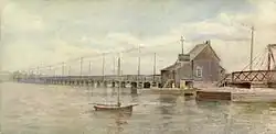 Cataraqui Bridge and Toll House circa 1900. Watercolor by Ella Isabel Fraser (1856–1943). View is to the east.