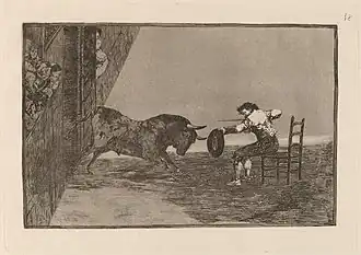 Bullfighting was not politically sensitive, and the series was published at the end of 1816 in an edition of 320—for sale individually or in sets—without incident. It did not meet with critical or commercial success.[1] Goya was always charmed by bullfighting, a theme that obviously inspired him, since it was the subject of many of his works: in a self-portrait (c 1790–1795) he depicted himself in a bullfighter's suit; in 1793 he completed a series of eight paintings on tinplate, created for the Royal Academy of Fine Arts of San Fernando, which depicted scenes from bulls' lives from the moment of their birth to the time they enter the bullring; in 1825 he made the series Los toros de Burdeos (The Bulls of Bordeaux; 1825), of which Delacroix purchased a copy.[2] Indicative of his love for bulls is the fact that he signed one of his letters as Francisco de los Toros (Francisco of the Bulls).[3][4]