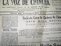 La Voz de Chincha ('The Voice of Chincha') was a daily evening newspaper published from Chincha Alta, Peru.[1][2] The newspaper was founded in 1924.[2][3] Politically, it was supportive of the different governments in power during its existence.[4] It carried the byline Diario independiente defensor de los intereses de la provincia ('Independent daily, defender of the interests of the province').[5]