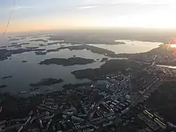 Laajalahti from the air. The Natura 2000 area is shown in the background. On the left is Westend in Espoo, on the right are Meilahti and Seurasaari in Helsinki.