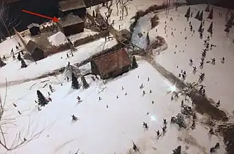 The Lacolle Mills Blockhouse is a timber framed square two-storey structure. The second-level floor is cantilevered with a pavilion roof.[5] The blockhouse is built on land that overlooks the Lacolle River.[5] The blockhouse's architecture was typical of a small defensive military structure in the area not requiring significant experience to construct.[5] The blockhouse walls are constructed of squared half timber stacked horizontally.[5] The walls have loopholes, providing the occupant with protection, while firing on the enemy.[5] In the centre of the blockhouse was a stone hearth, which provided heating.[5] The British military constructed over 25 forts of this type in Lower Canada between 1760 and 1840.[5]