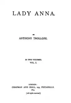Lady Anna is a novel by Anthony Trollope, written in 1871 and first published in book form in 1874. The protagonist is a young woman of noble birth who, through an extraordinary set of circumstances, has fallen in love with and become engaged to a tailor. The novel describes her attempts to resolve the conflict between her duty to her social class and her duty to the man she loves.