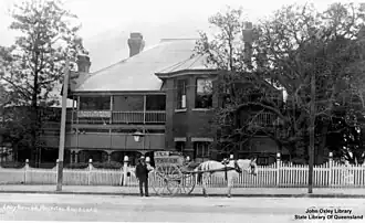 The foundation stone of the new hospital was laid by Lady Alice Norman, wife of Queensland Governor Henry Wylie Norman, on 29 May 1889.[10] The hospital was officially opened on Saturday 28 December 1889 by Lady O'Connell.[11] The first patients were admitted to the hospital on 1 January 1890. No major additions or alterations were made to the complex until 1923 when the government approved the expenditure of £15,000 for the construction of a Nurses' Quarters to the west of the original building.[1]