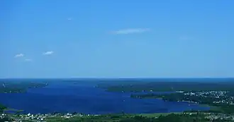 Lake Blouin (French: lac Blouin) is an ellipse shaped natural fresh water lake in the Abitibi-Témiscamingue Administrative Region, Quebec, Canada. The lake, oriented on a southwest–northeast axis, measures 13.5 km (8 mi) in length and has a maximum width of 2 km (1 mi).[2] It is relatively shallow with a maximum depth of 30 m (98 ft), and is located just north of the city of Val-d’Or, Quebec. It is fed by the Bourlamaque and Senneville rivers and is the headwater of the Harricana River. All three rivers are situated near its northeastern end. The shore of lake Blouin is lined with small rocky outcrops and sandy beaches. The lake lies within the Clay Belt, a vast tract of fairly flat land with fertile soil covering 180,000 km2 (69,000 sq mi) in northwest Quebec and northeast Ontario.[3]
