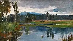 In 1909, a small hydroelectric station was built on the Kaniere River, at a cost of £15,000, to power the pumping equipment at the Ross gold mine.[9] Water is taken near the weir at the northern end of the lake and travels 9 km through a series of tunnels and flumes to a twin power plant capable of generating 520 kW; the water race was originally used for gold sluicing in the Kaniere area. The most prominent of the wooden flumes, Johnson's Flume, collapsed in 1973 and was replaced by earthworks. The Kaniere Forks power station later supplied the gold dredge at Rimu, and after 1931 exclusively generated power for Hokitika, today supplying 3.75 GWh annually to the town.[9][10] A 3½ hour walkway follows the water race, part of the West Coast Wilderness Trail.[11]
