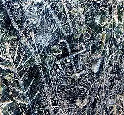 The Lakh Mazar inscriptions contain swastikas or spinning wheels inscribed on stone walls. One instance is in Khorashad, Birjand, on the Lax e Mazar. Due to vandalism, some have been destroyed.[1][2]