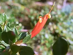 The Lambertias are sclerophyllous shrubs or small trees. The common name, wild honeysuckle, is due to the flowers, which are asymmetrical with a long floral tube and tightly rolled lobes, in red, orange, yellow and green.
