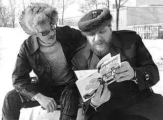 From left to right: director Seppo Huunonen and actor Leo Lastumäki reading Lampaansyöjät novel in February 1972