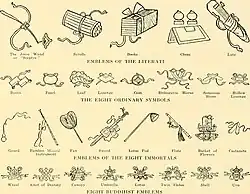 In most art of the Eight Immortals, Lan can be recognized as the one that carries a basket of fruit and/or flowers.[1][2][11][3][10][21] Sometimes Lan carries the basket in hand, and other times, slung on a hoe over the shoulder.[10] This basket is Lan's distinctive emblem,[10] and is connected to how Lan is the patron of florists.[8][3] Lan's basket contains plants and medicinal herbs associated with longevity, including: the magic fungus (lingzhi mushroom, Ganoderma lucidum), which resists decay, and in Traditional Chinese medicine is used to prolong life;[10][22] sprigs of bamboo[10] and pine,[10] which as evergreen plants, symbolize longevity;[22] flowering and leafless plum, because they show vitality in blooming in early spring from seemingly lifeless branches;[10] chrysanthemums;[10] and heavenly bamboo (Nandina domestica) with red berries.[10] As with the emblems of each of the Eight Immortals, sometimes Lan's basket is depicted by itself. As a motif, Lan's basket is popular in decorations for the Chinese New Year, and represents riches and abundance[23][24] Lan's flower basket, along with the emblems of the rest of the Eight Immortals, appear in such places as on a Qing dynasty 19th century imperial dragon robe.[25][26]