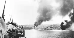 During the night, McCawley, having rendezvoused with the tug Pawnee, was mistakenly sunk by American PT boats, being struck by two torpedoes at 20:23. By this time, Turner had transferred his flag to the destroyer Farenholt.[39][40] Meanwhile, the same night, a Japanese naval attempt to attack the American beachheads failed when five Japanese destroyers appeared off the west coast of Rendova but could not attack because of a violent squall.[41] After the lightly contested landings, the bulk of the surviving Japanese forces retreated to Munda Point on nearby New Georgia, moving back via canoe. Troops from the 172nd Infantry Regiment expanded the beachhead on 1 July, with patrols securing half the island, while the 3rd Battalion, 103rd Infantry Regiment landed around the Poco Plantation in Landing Craft Infantry vessels.[42]