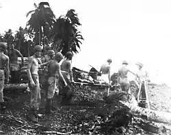 Base development work around Rendova began shortly after the landings, with the 24th Naval Construction Battalion undertaking road construction work, including the creation of corduroy roads to facilitate movement of heavy vehicles and artillery in the muddy conditions. Under the threat of air attack, three bulldozers were destroyed in this effort, and 20 men were killed.[54] The beach was extended using coral fill, while Marston Matting was also laid in an effort to combat the mud, but their weight, coupled with that of the heavy vehicles employed to move the 155 mm artillery pieces resulted in the roads sinking into the mud.[55] The 118th Engineer Combat Battalion attempted to drain the area around the eastern landing beach, but this proved fruitless and the area was ultimately abandoned in favor of some of the barrier islands, which were used as staging areas.[56]