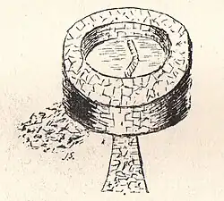 John Smith recorded up to six crannogs in Ashgrove Loch, one, on the eastern side, is said to be unique as a crannog in that it was mainly of a stone rather than the usual timber construction with a causeway built of large sandstone blocks.[20] It is possible that this 'crannog' was actually a dun or mediaeval fort. A considerable number of relics were found, such as chisels, wooden spoons, shears, bone implements, etc.[23] A local tradition holds that the treasures of Kilwinning Abbey were hidden on a crannog in the loch by the monks when the abbey was sacked during the reformation. The proximity of the old 'Kings Road' to Portencross to the site is of interest in this regard.