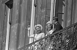 Queen Juliana, Princess Irene, and Prince Bernhard at the balcony of the palace on Prinsjesdag (1959)