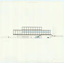 The design of the current Langelinie Pavilion shows inspiration from Mies van der Rohe and American Modernism. The building is composed of three box-like volumes. The low ground floor is built in reinforced concrete and appears closed with its narrow, highly placed horizontal windows. The "floating" main floor is significantly larger and higher than the ground floor. It measures approximately 30 by 30 metres and has a curtain wall in glass with thin, exterior steel pillars. The upper floor is again smaller and lower than the main floor. It opens to a narrow balcony to the east.[5]